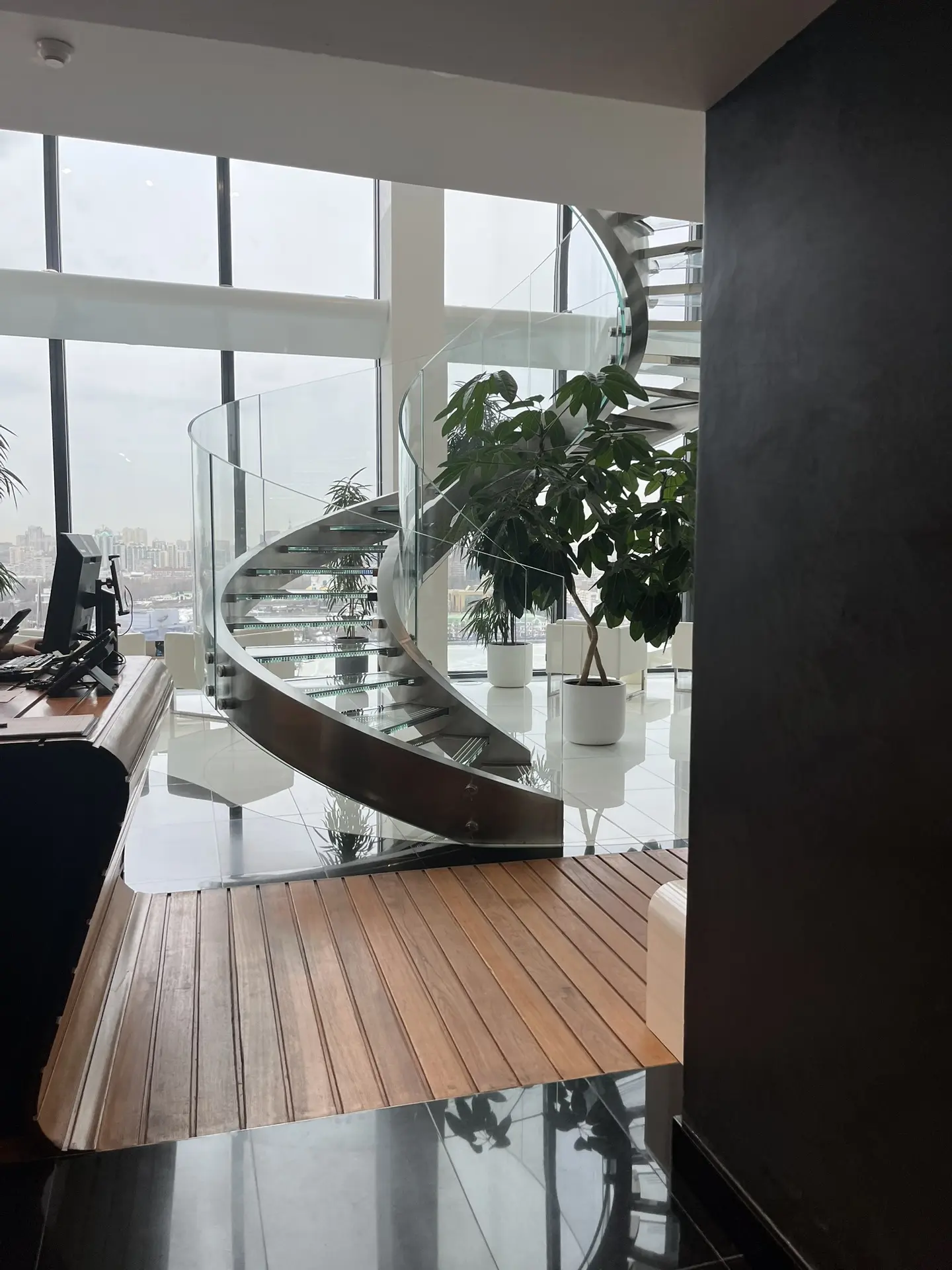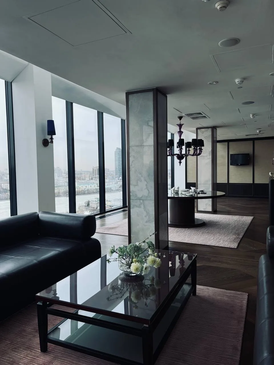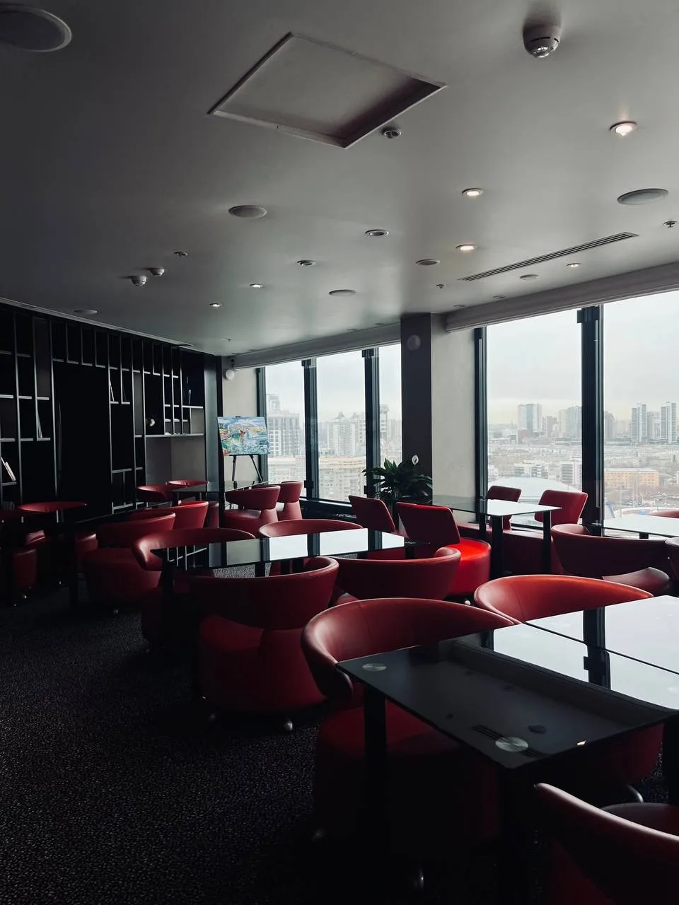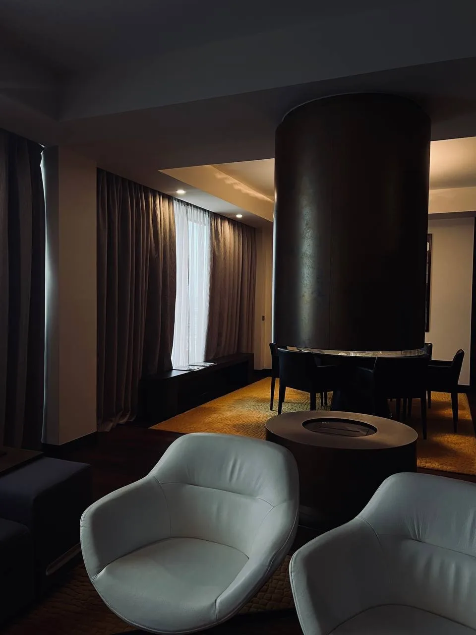 Сначала нас привели в стандартный номер. Круглая мебель, огромные панорамные окна и… стеклянная стена душевой, из которой открывается вид и на номер, и на город. Сначала это кажется необычным и стеснительным, но потом понимаешь: выглядит очень смело и даже романтично. Вишенкой на торте стал президентский номер с гостиной, двумя санузлами и с собственным кабинетом. Вы представляете? Стеллаж почти во всю ширину гостиной, сделаный из настоящего мрамора (вместе с просторной ванной комнатой), огромная мебель, невероятные панорамные виды — мы почувствовали себя в сказке. А ещё мы заглянули в двухэтажный пентхаус «Царский». Но, к сожалению, он не пользуется большим спросом — там никто не останавливается, только проводят редкие встречи. Но панорама и лестница не могут не впечатлить.